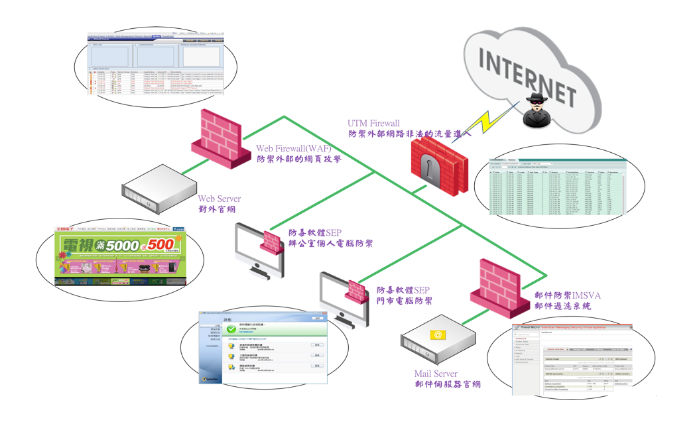 •增進網路、端點及應用安全:公司網路層已配置入侵防禦設備防火牆UTM Firewall,可有效保護公司不受已知、零時差、阻斷服務(DoS)、分散式阻斷服務 (DDoS)等攻擊,並免於間諜軟體、惡意軟體、蠕蟲、木馬程式等威脅。於應用程式端,使用應用程式防火牆Web Firewall(WAF)可以提供公司網站應用程式的全面防護,諸如SQL注入、 XSS跨站攻擊、 CSRF偽冒交易 快取污染與Session篡改等現今非常流行的已知與未知攻擊。並提供SSL解密以確保網站資料即使經由加密也能受到保護。以確保公司營運資料的機密性、可用性與完整性。