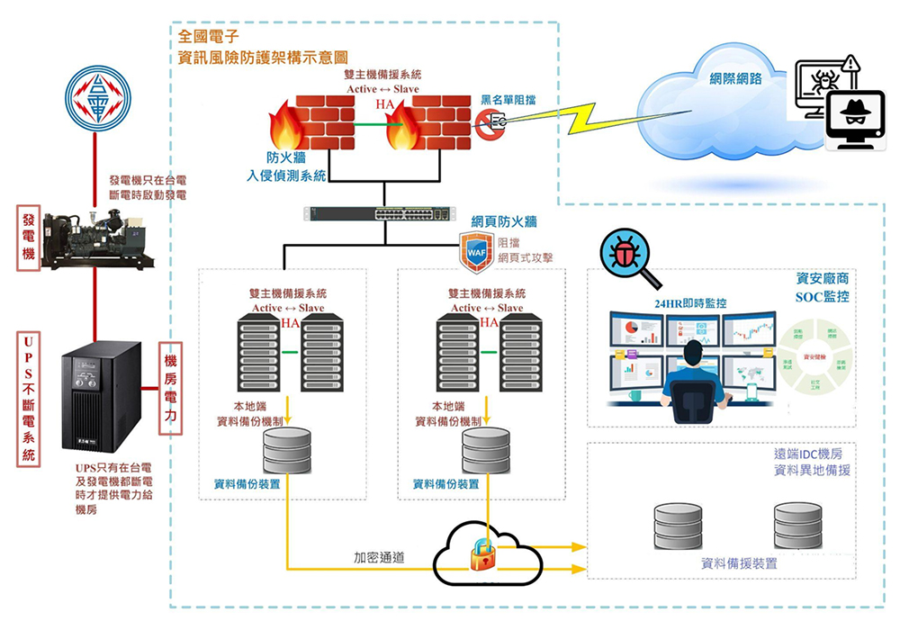 •持續營運:公司內重要系統皆有雙主機備援機制,並遠端備份至IDC機房,機房內備有UPS不斷電系統以及發電機供電。